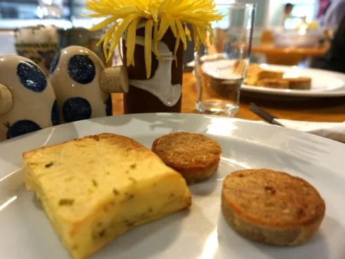 Cousin to black pudding (blood sausage), but of lighter colour without the blood, the cupcake shaped sausage is made of pork, suet, oatmeal and spices. Reports from the traveling gang are thumbs up as I dream of licking the plate of my devoured potato cake.
