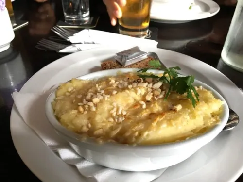 A dish of Dublin Coddle with its ingredients of bangers, rashers, potatoes and onions for one of our group. Beef and Guinness Pie with the two show stopping ingredients sharing the title for another.