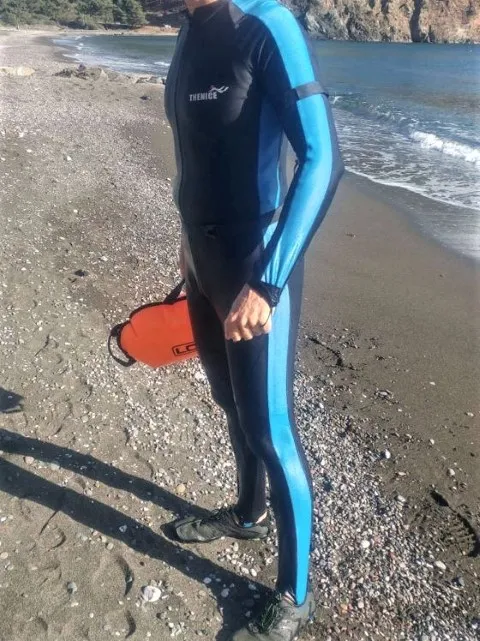Put it this way, my first open-water swim was a total failure. I went down to the beach, but on my own; then ended up using so much energy fighting to get the wetsuit on that I was too knackered to even swim – hmm, lessons learned, as they say. More YouTube education ensued, plus discussions with my ‘advisor’, plus training my son to help the old fella ‘lock n load’ eventually got me into the water to actually attempt a swim.